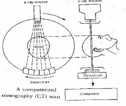 Вузькоколімований (обмежений) рентгенівський пучок сканує (переглядає) тіло пацієнта по колу. Проходячи через тканини, випромінювання послаблюється відповідно щільності і атомному складу цих тканин. По іншу сторону від пацієнта і трубки встановлена кругова система детекторів рентгенівського випромінювання, кожен з яких (а їхня кількість може досягати 1000 і більш) перетворюють енергію випромінювання в електричні сигнали. Ці сигнали трансформуються у цифровий код, що зберігається у пам'яті комп’ютера. Зафіксований сигнал відбиває ступінь ослаблення в певному напрямку. Обертаючись навколо пацієнта, рентгенівський випромінювач “переглядає” тіло під різноманітними ракурсами, в загальній складності під кутом 360° До кінця обертання випромінювача в пам'яті комп'ютера фіксуються сигнали від усіх детекторів.
