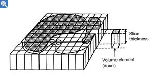 Томографічний шар тканини, що проходить дослідження, поділений на об’ємні елементи - вокселі. Ослаблення у кожному вокселі зумовлює яркість у відповідному пікселе.