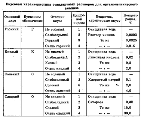 Ощущения вкуса условно обозначают буквенными выражениями: К — кислый, О — сладкий, Г — горький, С — соленый. Но ощущения вкуса гораздо богаче, чем 4 элементарные восприятия. В комплексном ощущении они комбинируются с осязательными, температурными и обонятельными восприятиями. Для дополнения основного вкуса следует ввести обозначения привкуса, например "КО" — кисло-сладкий, "ГС" — горько-соленый и т. д., где первая буква указывает на преобладание одного вкуса над другим.