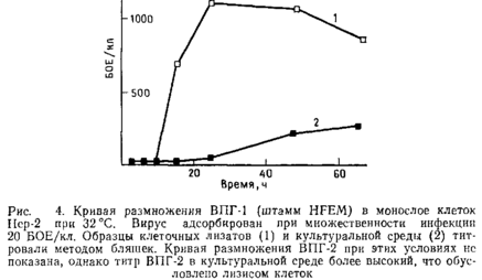Методы выделения вирусов простого герпеса довольно сложны по сравнению с другими вирусами. Более того, метод, хорошо зарекомендовавший себя при работе с одним штаммом вируса на определенной клеточной линии, может оказаться неприемлемым для других штаммов на той же линии или того же штамма вируса на других клетках. Поэтому мы опишем два метода. Мы показали, что первый метод можно успешно применять для получения штамма HFEM и некоторых других при условии, что для выращивания вируса используют клетки Нер-2. Данный метод прост и позволяет получать вирусные препараты высокой степени чистоты. Второй метод позволяет достигнуть удовлетворительных результатов со всеми штаммами вируса и различными типами клеток. Для выбора оптимальных условий получения высокого выхода вируса и качественного исходного материала для дальнейшей очистки следует вначале изучить кривую роста исследуемого вирусного штамма на различных линиях клеток. На рис. 4 показана кривая роста штамма HFEM на клетках Нер-2 при высокой множественности инфекции и культивировании клеток при 32°С.
