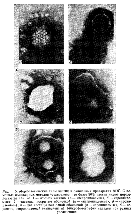 Полученный вирус уже достаточно очищен и может быть использован в различных целях. Кроме того, степень чистоты вируса можно повысить, как описано выше. Очищенный вирус, полученный любым методом, ресуспендируют в дистиллированной воде или в соответствующем буфере. Аликвоты суспензии можно использовать для заражения клеток, подсчета общего числа частиц и определения концентрации белка. Вирус хранят при –70°С, однако следует учитывать, что оттаивание ведет к частичному разрушению вирусной оболочки. На рис. 5 показаны различные вирусные частицы, обнаруженные в препаратах очищенного вируса.