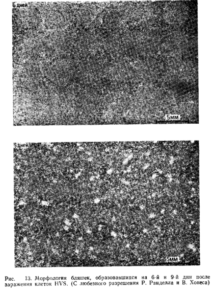 Немного раньше бляшки формируются в монослойных первичных культурах мармозеток. На рис. 13 показана морфология бляшек HVS через 6 и 9 дней после начала инфекции.