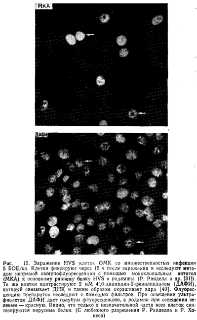 Возможно, что репликация вируса зависит и от клеточного цикла. Эти сложные исследования велись с помощью иммунофлуоресценции на основе моноклинальных антител к антигенам зараженных клеток.