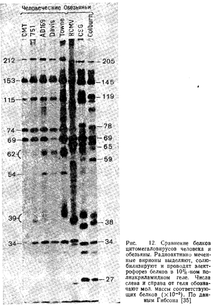В результате первого градиентного центрифугирования получают осадок, содержащий большое количество вируса. Осадок можно ресуспендировать и дополнительно очистить вторым градиентным центрифугированием. Фракции очищенного вируса могут быть использованы для определения концентрации белка, количества физических частиц и инфекционного титра. Для исследования вирусных частиц электрофорезом в полиакриламидном геле вирус разрушают, как описано выше для ВПГ. Спектр структурных полипептидов HVS штамма 11 показан на рис. 16.