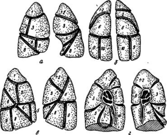 Сегмент – участок легочной ткани, имеющий свои сосуды и нервные волокна. Каждый сегмент напоминает по форме усеченный конус, вершина которого направлена к корню легкого, а широкое основание покрыто висцеральной плеврой. В центре сегмента располагаются сегментарный бронх и сегментарная артерия, а на границе с соседним сегментом – сегментарная вена. Легочные сегменты отделяются друг от друга межсегментарными перегородками, состоящими из рыхлой соединительной ткани, в которой проходят межсегментарные вены (малососудистая зона). В норме сегменты не имеют четко выраженных видимых границ, иногда заметны благодаря разнице в пигментации. Бронхо-легочные сегменты – это функционально-морфологические единицы легкого, в пределах которых первоначально локализуются некоторые патологические процессы и удалением которых можно ограничиться при некоторых щадящих операциях вместо резекций целой доли или всего легкого. Существует много классификаций сегментов.