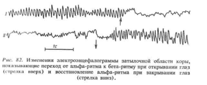 При нанесении различных раздражений, открывании глаз, умственной работе альфа-ритм быстро сменяется бета-ритмом. Это явление смены редкого ритма на более Частый получило название реакции активации (десинхронизации) (рис. 82),