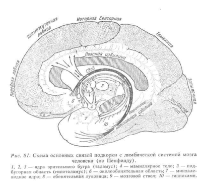 Лимбической системой называют наиболее древнюю часть коры большого мозга, расположенную на медиальной (внутренней) стороне больших полушарий. Основными структурами лимбической системы являются: поясная извилина, которая окаймляет мозолистое тело, парагиппокамальная извилина, собственно гиппокамп, Миндалевидное ядро (рис. 81). Чем более развито животное, тем относительно меньшую область занимает Лимбическая система головного мозга.