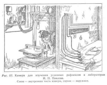 Для формирования условных рефлексов необходима определенная обстановка. Быстрее, легче условные рефлексы формируются при отсутствии посторонних раздражителей. В связи с этим в лаборатории И. П. Павлова изучение условных рефлексов проводили в специальной камере, изолированной от окружающего мира (рис. 83).