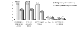 Після закінчення прийому аторвастатину концентрація ЗЛ в сироватці крові достовірно (t=3,06) знизилася в середньому по групі на 17,6%, концентрація в-ЛП достовірно (t=3,34) знизилась майже на 30%.
