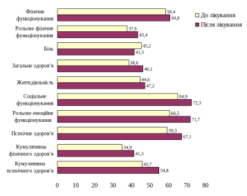 Звертає увагу тенденція (р>0,05) до збільшення соціального функціонування пацієнтів за рахунок його рольової складової, яка достовірно (р<0,001) збільшилась з 60,5±3,4% до 71,7±2,9% при одночасному поліпшенні структурного показника "психічне здоров'я" (р<0,001).