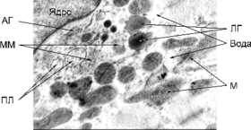 Рис. 1. Будова кардіоміоцита у морських свинок за умов гострої сироваткової хвороби (набряк мітохондрій та саркоплазми, релаксовані міофібрили): М – мітохондрії; ПЛ – первинні лізосоми; АГ – апарат Гольджі; ЛГ – ліпопротеїнові гранули; ММ – мікроміхурці; Зб. – Ч 21000