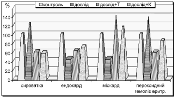Підвищена активність антиоксидантного захисту сприяла окисно-відновним перетворенням -SH-груп (див. табл. 3, рис. 2). Під впливом обидвох препаратів (тіотріазолін і корвітин) достовірно (Р < 0,001) зросла кількість сульфгідрильних груп в ендокарді та міокарді, одночасно з тим, зменшилася їх кількість у сироватці крові.