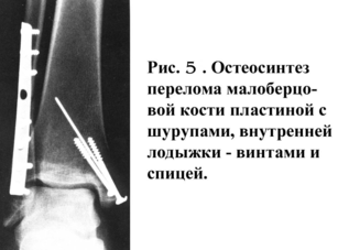 Для остеосинтеза применяют различные металлоконструкции. В последние годы широкое распространение получил накостный остеосинтез компрессирующими пластинами с шурупами (рис.5). Способ позволяет надежно фиксировать отломки на весь период консолидации и полностью отказаться в послеоперационном периоде от средств внешней фиксации поврежденной конечности. Это значительно сокращает сроки реабилитации пострадавших.