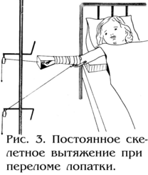 Поврежденная конечность при лечении методом постоянного скелетного вытяжения должна занимать определенное вынужденное положение. Так, при переломах лопатки рука должна занимать такое положение: в плечевом суставе - отведение до угла 90, в локтевом – сгибание 90 (рис. 3). Предплечье должно находиться в среднем положении между пронацией и супинацией и фиксироваться клеевым вытяжением с грузом по оси предплечья до 1 кг. При переломах плеча положение руки почти такое же, только в плечевом суставе рука находится в положении сгибания до угла 90. При переломах нижней конечности нога укладывается на шину Белера, конструкция которой позволяет достичь равномерного расслабления мышц-антагонистов.