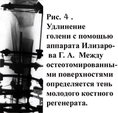 Внеочаговый компрессионно-дистракционный метод лечения. Так назвал его основоположник профессор Илизаров Г. А. Он же предложил и аппарат собственной конструкции, который состоит из металлических колец различного диаметра и телескопических штанг для соединения этих колец. Сущность этого полуоперативного –полуконсервативного метода лечения заключается в том, что в зоне повреждения кости не вмешиваются. Иногда даже не вскрывается место перелома. Выше и ниже перелома проводят по две пары спицы (такие же, как для скелетного вытяжения, только большего диаметра) во взаимоперпендикулярных плоскостях. Затем попарно эти спицы закрепляют в кольцах, которые между собою соединяются штангами, чаще всего последовательно. Аппарат, состоящий из 4 колец (по два - на центальном и периферическом отломке), позволяет репонировать отломки и создать достаточную компрессию в зоне перелома для надежного сращения имеющегося повреждения. При ложных суставах вначале создают достаточную компрессию, позволяющую разрушить мягкие ткани в зоне патологического процесса, а затем начинают постепенное удаление колец аппарата друг от друга - дистракцию, добиваясь “оживления” репаративного остеогенеза в месте ложного сустава, достигая полной консолидации и восстановления непрерывности кости. С помощью аппарата своей конструкции Илизаров предложил производить и удлинение конечностей (рис. 4).