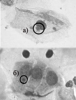 Як видно, у одного хворого можуть зустрічатись клітини, що мають характерні включення та сумнівні. Практично у всіх хворих з характерними включеннями також були присутні й сумнівні. У частини хворих включення не виявлялися взагалі. Виходячи з даних табл. 5, стає очевидним достатньо високий ризик хибнопозитивних результатів цитологічного дослідження, особливо якщо орієнтуватися на включення із сумнівною морфологією. Найбільша частота їх виявлення мала місце у епітеліальних клітинах з слизової оболонки уретри жінок – у 40,7% випадків. Ці включення можуть утворюватися за різних станів, пов’язаних із зміною метаболічних процесів клітини (рис. 4б).