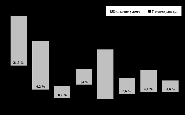 | Виявлено, усього | 5 | 10±4,0 | 46 | 40±5,0 | 17 | 13±4,0 |