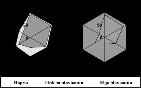 У хворих, що мали позитивний клінічний ефект при застосуванні адекватної терапії показник БАФК до лікування був зниженим, а після лікування підвищувався практично до рівня фізіологічної норми у всіх обстежених (рис. 3). У групі хворих без клінічного ефекту ці показники не мали суттєвої динаміки, а у окремих хворих достовірно знижувались. Відповідною була й функціональна активність фагоцитуючих клітин. У хворих з позитивним ефектом лікування цей показник суттєво підвищувався. У хворих, що не мали позитивного ефекту лікування показник ФАФК знижувався, що свідчить про виснаження клітинної ланки фагоцитозу (рис. 3).