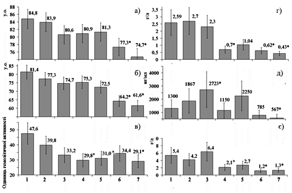 Рис. 2. Рівні визначених показників у змивах з цервікального каналу обстежених. а) ФАФК; б) БАФК; в) активність комплементу; г) рівень лізоциму; д) рівень лактоферину; є) концентрація секреторного IgA. 1 – контрольна група; 2 – бактеріальна інфекція; 3 – кандидоз; 4 – уреаплазмова моно- інфекція; 5 – уреаплазмова мікст-інфекція; 6 – хламідійна моно-інфекція; 7 – хламідійна мікст-інфекція. * - достовірно