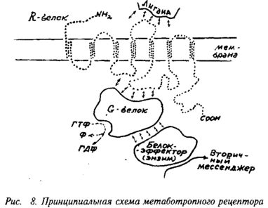 Метаботропные рецепторы представляют собой сложную систему, состоящую, по крайней мере, из трех белков: 1) собственно рецепторного белка, связывающегося с нейромедиатором; 2) так называемого G-белка, модифицирующего и передающего сигнал с рецепторного белка и 3) белка-эффектора, который является ферментом, катализирующим образование внутриклеточного низкомолекулярного регулятора, так называемого вторичного мессенджера. Пример метаботропного рецептора представлен на рис. 8.