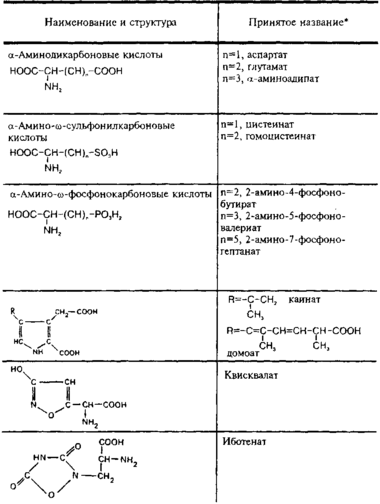 Согласно современным представлениям, существует несколько подтипов глутаматных рецепторов. Их классифицируют прежде всего на основе изучения действия широко известных аналогов глутамата: N-Memn-D-аспартата, а-амино-З-пид-рокси-5-метил-4-изоксазол-пропионовой кислоты, каиновой кислоты, квискваловой кислоты. В табл. 5 представлена структура дикарбоновых возбуждающих аминокислот и некоторых их аналогов. В литературе принято выделять прежде всего два главных подтипа глутаматных рецепторов: NMDA- и не-NMDA-рецепторы. К He-NMDA-рецепторам относятся рецепторы АМРА и каиновой кислоты, сходные по своим физико-химическим свойствам и распространенности в структурах мозга.