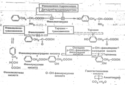 Схема 1. Варианты нарушений метаболизма фенилаланина.