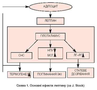 Ожиріння характеризується гіперлептинемією, яка вважається наслідком резистентності до дії лептину. Ймовірно, що жирова тканина як ендокринний орган здійснює адіпостатичну функцію, а за умов тривалого позитивного енергетичного балансу і збільшення маси тіла розвивається стан дисфункції жирової тканини, підсилюється її секреторна функція, що призводить до розвитку порушень метаболізму, супроводжуючих ожиріння.