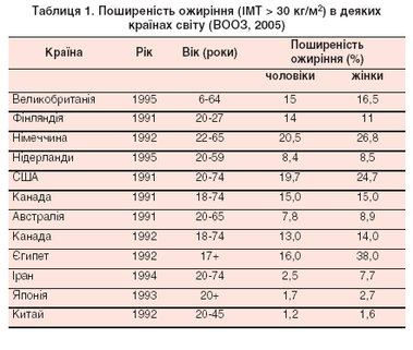 На сьогодні в більшості країн Західної Європи ожирінням (ІМТ > 30 кг/м2) страждає від 10 до 25% населення, у США – від 20 до 25%. Надмірну масу тіла (ІМТ > 25 кг/м2) в індустріально розвинутих країнах, окрім Японії та Китаю, має близько половини населення.