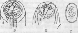 (Ancylostoma duodenale) - А. Ротовые капсулы нека-тора {Necator americanus) - Б и кривоголовки - В; Г - яйцо кривоголовки; 1 - ротовая капсула; 2 - пищевод; 3 - кишечник; 4 - семенник; 5 - семяизверга-тельный канал; 6 - половая сумка; 7 - спикула, 8 - режущие пластинки и зубцы.