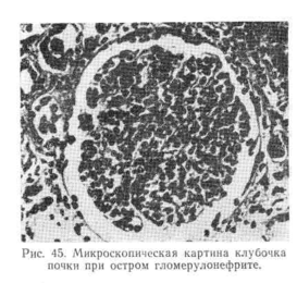 Основным проявлением острого гломерулонефрита является диффузный гломерулит с развитием интракапиллярной пролиферации. Клубочки увеличены, заполняют просвет капсулы (рис. 45). Среди клеток клубочка встречается много полиморф-ноядерных лейкоцитов. Поражение базальной мембраны капилляров клубочка, как правило, незначительно и ограничивается очаговым утолщением ее в местах пролиферации эндотелия. В зависимости от того, преобладает ли белковый экссудат, слущенный эпителий или лейкоциты и эритроциты в просвете капсулы клубочка, выделяют экссудативную, деструктивную и геморрагическую формы гломерулонефрита.