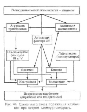 В настоящее время считают, что поражение клубочков при этом заболевании в 70 % случаев вызывается растворимым, циркулирующим в крови иммунным комплексом, состоящим из антигенов «нефритогенных» стрептококков и их антител, причем количество первых значительно больше, чем вторых. Эти комплексы, откладывающиеся вдоль наружной поверхности базальной мембраны капилляров клубочка, сами по себе мало повреждают ее, но вызывают цепную реакцию, в которой принимают участие три биологические системы: комплемента, коагуляции и кининовая, а также два типа клеток — полинуклеары и тромбоциты. Иммунные комплексы фиксируют комплемент и активируют третий компонент его, что, с одной стороны, способствует оседанию их в капиллярах клубочка, на которые воздействуют сосудодвигательные субстанции комплемента, а с другой — приводит к образованию факторов хемотаксиса, привлекающих полинуклеары и способствующих их фиксации подэндотелиально у базальной мембраны капилляров клубочка. Лизосомные энзимы полинуклеароз повреждают мембрану, вызывая «энзиматическую перфорацию» ее. Кроме того, полинуклеары выделяют гистамин и серотонин, повышающие проницаемость стенки сосудов, и катепсины, усиливающие синтез вазоактивных полипептидов — кининов.