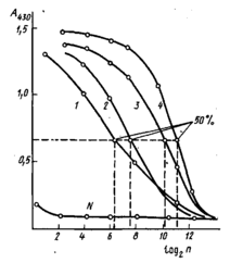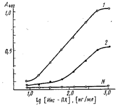 Результаты в этом случае обычно оценивают с помощью понятия "50% -ный титр". На рис. приведены кривые титрования антисывороток к инсулину, полученных иммунизацией морских свинок. Максимальный сигнал, регистрируемый по оптической плотности А продукта реакции окисления перекисью водорода 5-аминосалициловой кислоты, составляет ~1,4 оптических единиц. За титр сыворотки принимается ' такое разведение, при котором оптическая плотность, регистрируемая в ИФА, имеет значение, близкое к 0,7.