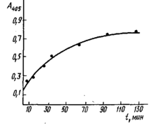 как С. Параметр С для реакций ряда антигенов был найден экспериментально, значение его не превышает 2-2,5. При этом оценка С получена в предположении, что реакция антител с иммобилизованным антигеном достигает равновесия. Кинетика этого процесса представлена на рис., из которого видно, что время установления равновесия значительно больше используемого в эксперименте при определении константы. Поэтому полученное значение С является максимальным и максимальная ошибка, которая допускается при определении Ku, составляет 200-250%.