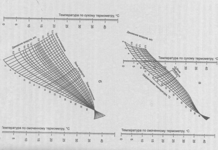 Рис.1. Номограммы для вычисления эквивалентно-эффективной температуры по основной шкале для одетого (а) и раздетого (б) человека (по В.А. Яковенко)