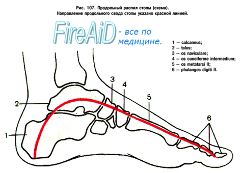 Продольный свод стопы можно представить как систему из пяти дуг, каждая из которых начинается от пяточного бугра и проходит вперед до головки соответствующей плюсневой кости. С внутренней стороны стопы ее продольный свод выше, с наружной - ниже. В этом легко убедиться даже при взгляде на подошвенную поверхность стопы. Наружная часть стопы служит опорой при стоянии и ходьбе, внутренняя пружинит при движении. Поэтому наружную часть продольного свода стопы (образованную дугами, идущими к IV и V пальцам) принято называть опорным сводом, а внутреннюю часть (I-III дуги) - рессорным сводом.