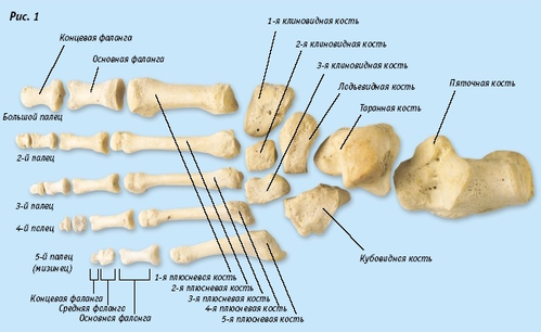 Скелет стопы человека, так же, как и кисть подразделяется на три отдела: предплюсну, плюсну и фаланги пальцев (рис.1).