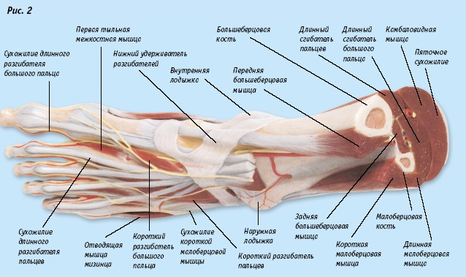 Стопа производит следующие движения: сгибание, разгибание, отведение, приведение, поворот внутрь и наружу. Все движения осуществляются в суставах при помощи мышц голени (рис.2). На стопе располагаются сухожилия длинных мышц голени, сгибающих и разгибающих стопу и ее пальцы, а также собственные мышцы стопы.