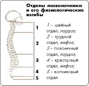 Окружающие позвоночник мышцы образуют так называемый мышечный корсет, удерживающий позвоночник в правильном положении. Нормальный позвоночный столб имеет четыре физиологических изгиба: шейный, обращенный выпуклостью вперед, грудной – выпуклостью назад, поясничный – выпуклостью вперед, и крестцово-копчиковый – выпуклостью назад. Изгибы с выпуклостью вперед называются лордозами, а с выпуклостью назад – кифозами