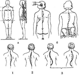 Признаки нормальной осанки (а). Метод определения искривления позвоночника (б). Виды сколиоза: 1 - правосторонний; 2 - левосторонний; 3 - S- образный