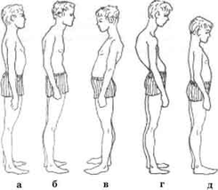 Виды осанки: а - нормальная; б - сутуловатая; в - лордотическая; г - кифотическая; д - выпрямленная (плоская)
