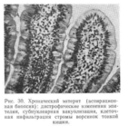 Рентгенологически часто устанавливается повышенная перистальтика тонкой кишки, а при тяжелых формах отмечаются изменения рельефа слизистой оболочки в виде уширения складок, крупнопятнистого рельефа, неравномерной зубчатости по контурам, сглаженности, что гораздо раньше и более четко выявляется в условиях искусственной гипотонии в сочетании с заполнением через зонд отдельных участков кишки бария сульфатом (Ю. В. Линевский) (рис. 29); кроме того, удается выявить мелкие зернистонодулярные образования на рельефе слизистой оболочки (увеличенные одиночные лимфатические фолликулы). Наконец, диагноз могут подтвердить данные аспирационной биопсии тонкой кишки (рис. 30).