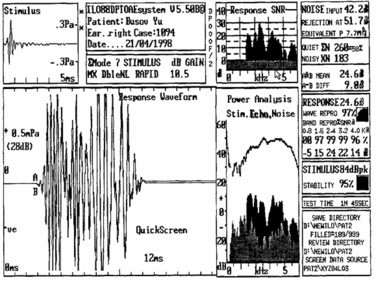 ЗВОАЭ представляет собой 2-3 (реже более) группы колебаний различной частоты, возникающих через 6-8 мс после начала стимула и продолжающихся в течение 20-30 мс. Как уже отмечалось, их амплитуда очень мала. Для регистрации ЗВОАЭ используют вводимый в наружный слуховой проход зонд, в корпусе которого размещены миниатюрные телефон и микрофон. Стимулами служат широкополосные акустические щелчки, предъявляемые с частотой повторения 20-50/с. Допустимо и более частое повторение стимулов. Отводимый микрофоном ответный сигнал усиливается при полосе пропускания от 500 до 5000 Гц и направляется в компьютер через аналого-цифровой преобразователь. Обычно для получения четко идентифицируемого ответа необходимо усреднить 250-500 постстимульных отрезков длительностью по 20-30 мс каждый.