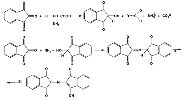 Нингидриновая реакция является общей для а-аминокислот, иминокислот, полипептидов. Нингидрин (1,2,3-трикето- гидринденгидрат) образует с аммиаком, выделившимся из этих соединений, продукт конденсации — ион дикетогидрин- дилидендикетогидрамина, имеющий сине-фиолетовое окрашивание: