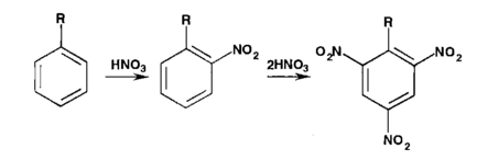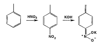 Под действием гидроксидов калия (натрия) продукты нитрования образуют окрашенные ацисоли: