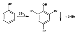 Раилии галогенирования (бромирования и йодирования) по типу реакции элеюрофильного замещения используют для обпроизводных фенолов и первичных ароматических аминов. Наличие в их молекулах заместителей первого рода (оксл- и аминогруппы) обусловливает происходящий процесс образования трибромфенола или триброманилина (белый осадок):