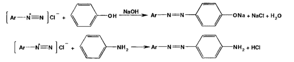 Азосочетание (взаимодействие соли диазония с фенолом или ароматическим амином). Сочетание происходит в ор- пю- или паря-положеннях по отношению к гидроксильной или аминогруппе, но идет легче в псрс-положении: