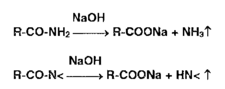 Реакции разложения амидов происходят при нагревании в растворах едких щелочей с образованием аммиака или алки- ламинов. имеющих характерный запах:
