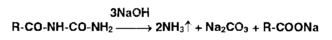 Ациклические и циклические уреиды, алкилуреиды сульфокислот, производные гуанидина и семикарбазона, имеющие в молекуле уреидную группу, гидролизуются в щелочной среде с образованием аммиака. Например, уреиды: