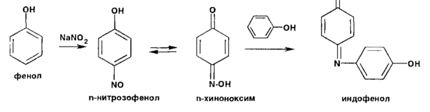 Фенолы образуют нитрозосоединения, бесцветные или окрашенные в сине-зеленый (фенол), сине-фиолетовый (резорцин) цвет. При нитрозировании фенолов с последующим окислением образуются индофенолы (интенсивно-синее окрашивание):