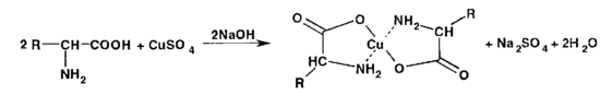 Аминокислоты с солями меди (II) образуют комплексные соединения, имеющие темно-синюю окраску: